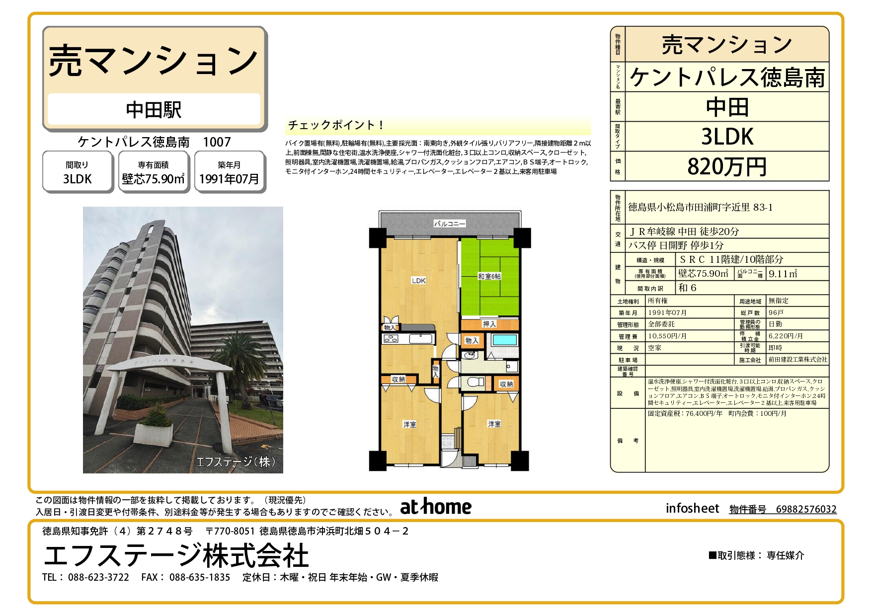 ケントパレス徳島南10階3LDK 820万円